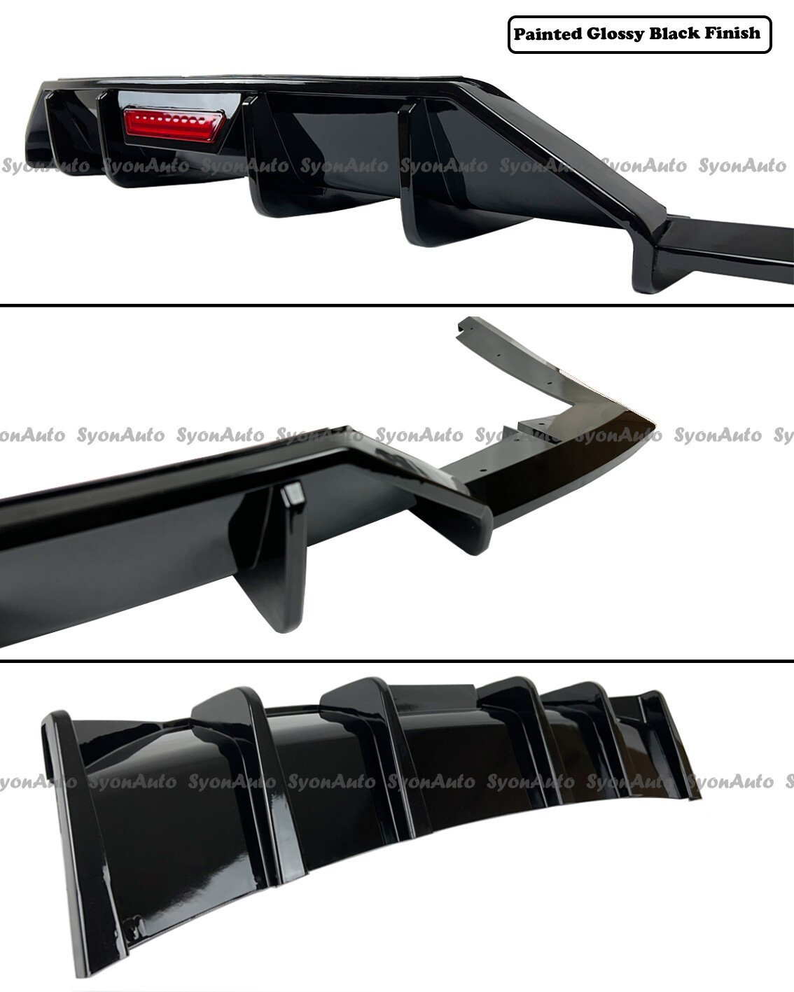 FITS 2021+ HYUNDAI ELANTRA GLOSSY BLACK SHARK FIN DIFFUSER W/ LED BRAKE LIGHT & SIDE SPLITTERS. 2021+ Hyundai Elantra All models Except for N-Line Models. Rear Bumper Diffuser in Shark Fins Vortex Design Featuring the 3rd LED Brake Light & Matching Side Splitters.