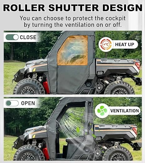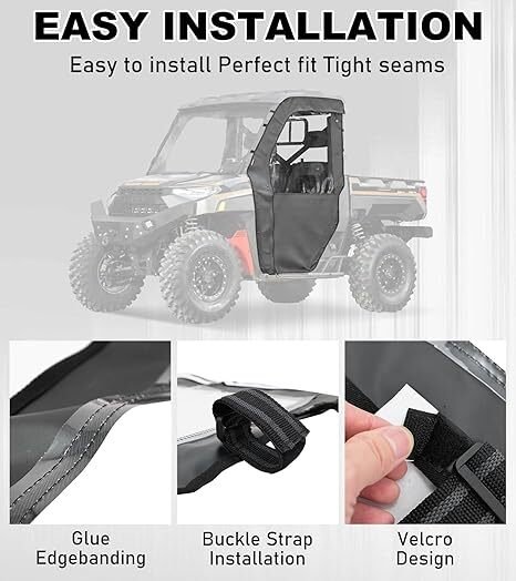 Soft Materials:Soft Cab Enclosure Upper Doors for Ranger 1000 XP, custom-designed for a seamless fit and easy to install. Enhances both functionality and style, providing added protection and a sleek, modern look. Durable for All-Season Use:Ranger Cab Enclosure designed for all-season use, effectively withstanding harsh weather conditions while protecting your Vehicle from rain, wind, and dust. Enhanced Driving Experience:Made with excellent clear vinyl material,Doors for Polaris Ranger 1000 enhance your driving experience by ensuring comfort without compromising visibility. Innovative Roll-up Design:Open for ventilation, close for protection,Ranger cab kit customizable for your adventure needs, offering flexibility wherever you go.