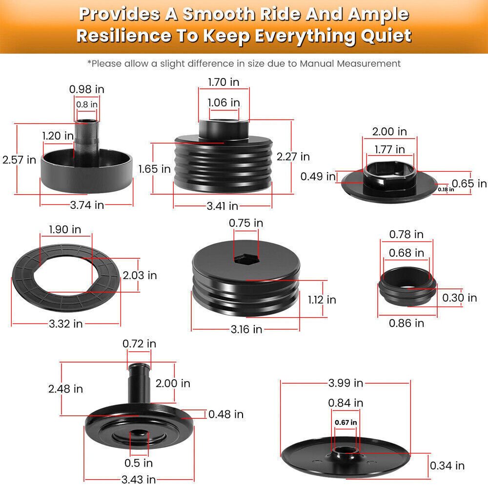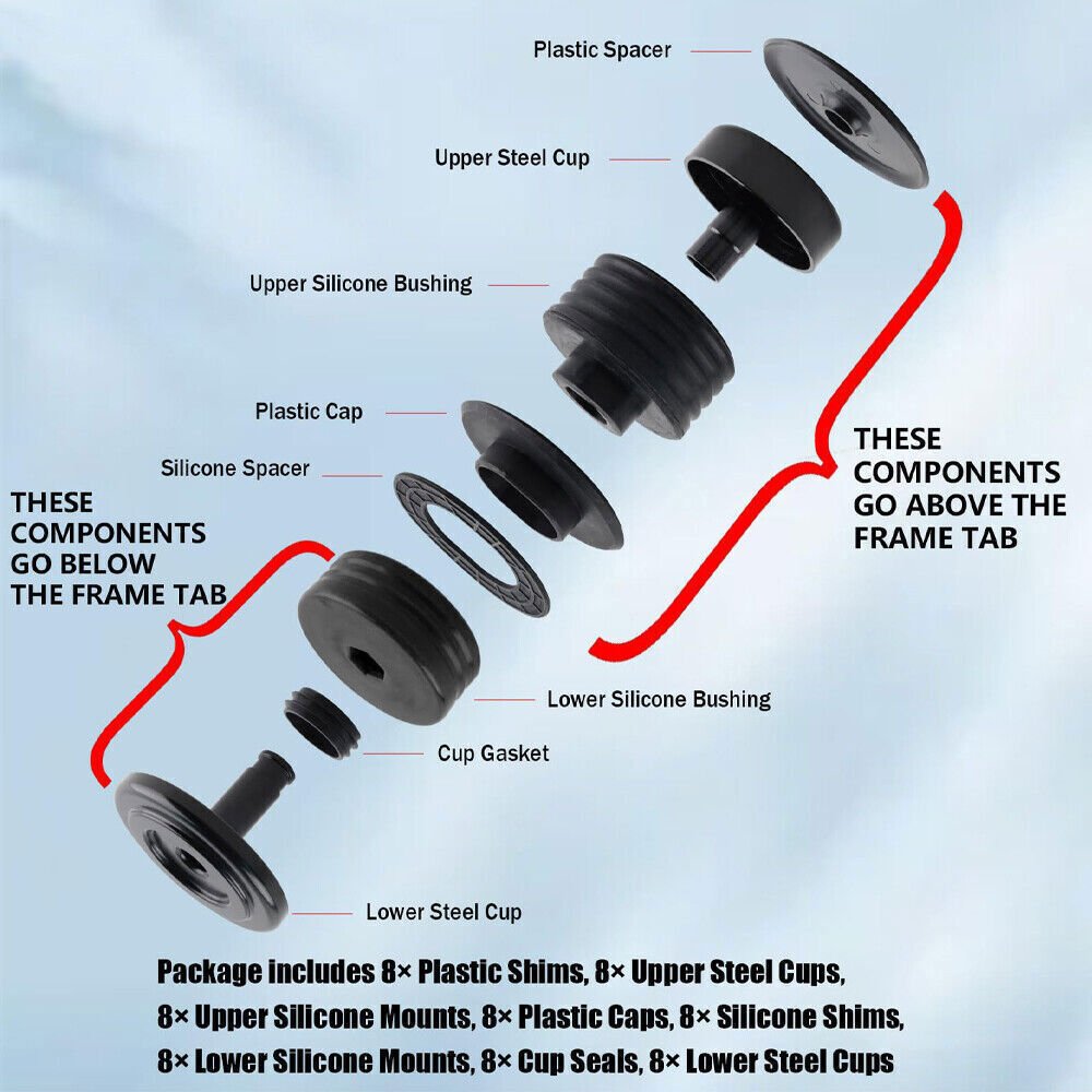Content: 8PCS premium silicone body cab mount bushing kit include 8× Lower Steel Cup 8× Cup Gasket 8× Lower Silicone Bushing 8× Silicone Spacer 8× Plastic Cap 8× Upper Silicone Bushing 8× Upper Steel Cup 8× Plastic Spacer.